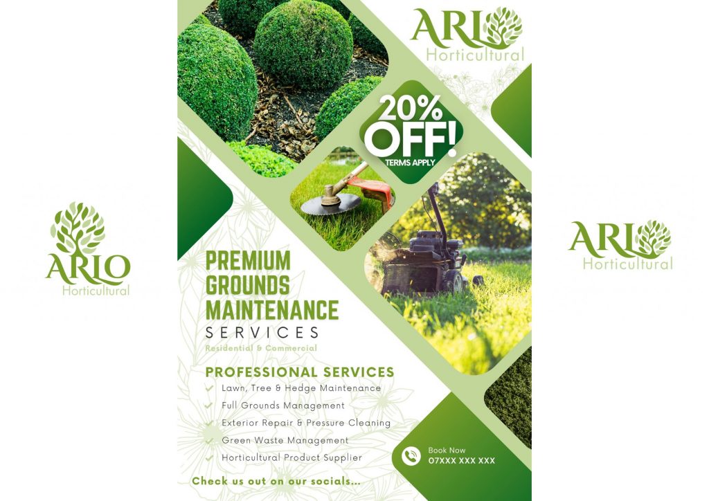 We created a professional logo and eye-catching business flyer for Arlo Horticultural, helping them establish a strong, credible brand presence. With a clean, nature-inspired design, the logo captures their values, while the flyer highlights their services and elevates their image. A simple but powerful setup to help them grow and stand out in a competitive industry.